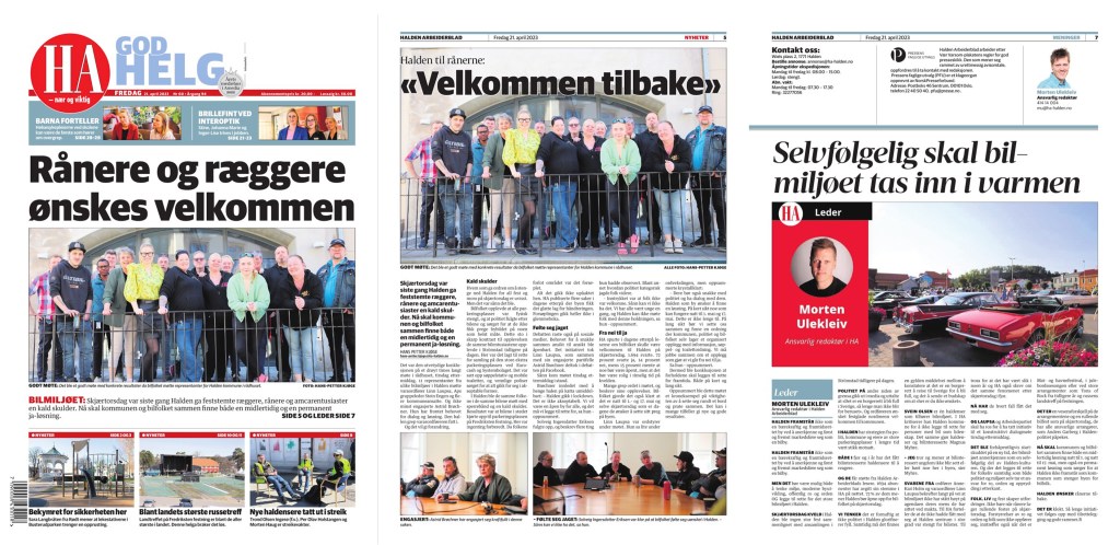 I Halden var bilfolket igjen samlet. For åpne gater. «Selvfølgelig skal bilmiljøet tas inn i varmen. Nå skal kommunen og bilfolket sammen finne både en midlertidig løsning som sørger for at Halden ikke framstår som kommunen som stenger byen for bilfolk», skrev HAs redaktør Morten Ulekleiv i sin lederartikkel 21. april 2023.