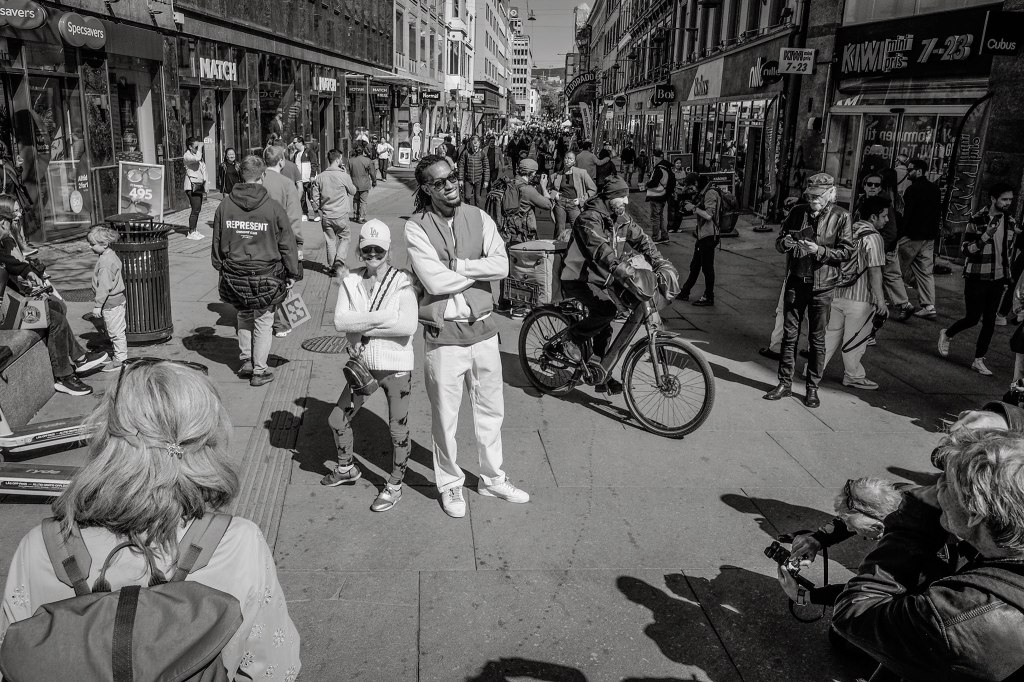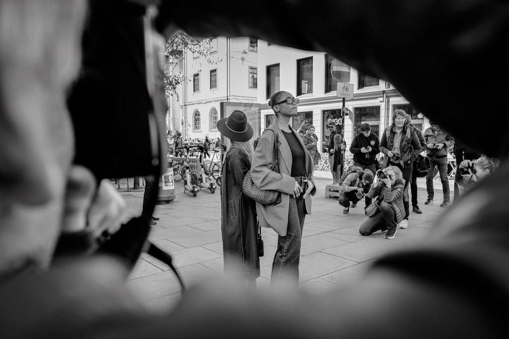 I Oslo sentrum hadde fotoworkshopen med modeller for å trene på dialog, lyssetting og timing/finne øyeblikket – og vi erfarte raskt at flere av byens skuelystne gjerne ville se på eller bli en del av «workshoppens street-theatre».